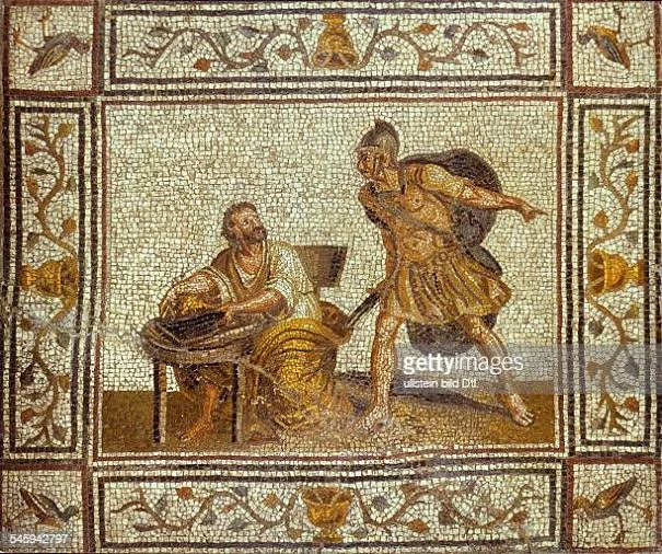 Archimedes before his death with the Roman soldier.
