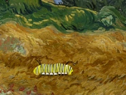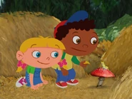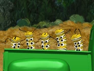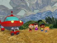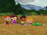 In A Brand New Outfit, Rocket stopped because they heard the caterpillar singing Beethoven 9th symphony ode to joy from the wheat field with cypresses. So Rocket uses his look and listen scope to listen to the sound of the beautiful song and it reveals that the song came from the wheat field with Cypresses. So Rocket flies to the wheat field with cypresses and landed at the grass field and the whole team headed out of Rocket. Then, Annie pushes the wheat to the side as the whole team watched and the sound came from the caterpillar who is on the mushroom and thee caterpillar sang ode to joy and the whole team knew about the caterpillar. Then, Annie sang the buggy wuggy song to the caterpillar and the whole team sang the buggy wuggy song with the caterpillar. As Quincy giggles about singing with the caterpillar. Afterwards, Quincy handed the yellow leaves to the caterpillar and the whole team watch as the caterpillar nibbles the yellow leaves that Quincy handed out. Soon, they heard the horn honk which came from the little green caterpillar truck as it came to the caterpillar field and the caterpillar crawls off the mushroom while the caterpillar truck atop at the sign to show that the little green caterpillar truck is going to the musical trees of many colors while the other four caterpillars sang a special song. Quincy asks as Leo takes a look a picture that it's showing that they're going to the musical tree of many colors as Annie mentioned as June asked the musical trees of many colors and Annie told that the musical tree of many colors is where the caterpillars goes to get their brand new outfit. Annie handed little caterpillar on to her hand and give a caterpillar a lift on the rear of the little green caterpillar truck and soon, Little caterpillar sang a special song first, and then the other caterpillar as Annie knew that they're all very excited about getting their brand new outfit at the musical tree of many colors. Soon, the caterpillar driver honk the horn on the little green caterpillar truck and the little caterpillar wave goodbye to the whole team as they left and soon, the green caterpillar truck hits a stone which causes little caterpillar to fell overboard as the team notice that little caterpillar had gone overboard at the end of the pickup truck and head after them as Annie wave to the caterpillar truck and told the little green caterpillar truck to wait. but it's too late. Then, Annie asked little caterpillar that if he's okay and he said yes and the caterpillar starts to move inch by inch as he's trying to make it to the musical tree of many colors. but Quincy knew that it's going to take a long time for the caterpillar to get to the musical tree of many colors. Leo agree about helping little caterpillar getting to the musical tree of many colors so he can get a brand new outfit. Leo told that they've got a mission about getting little caterpillar to the musical tree of many colors so he can get a brand new outfit as Annie mentioned. So they all head to Rocket as Annie hold little caterpillar in her hand and Rocket retracts his stair door. Before the pat sequence, Annie told Rocket that the Little caterpillar is going to sit on the back up seat and Rocket deploys an additional seat and Annie lowers little caterpillar onto the extra seat and the whole team buckle their seatbelts and little caterpillar also buckle his seatbelt and the whole team did the pat sequence and pat faster to deploy Rocket's engine and lastly the whole team raise their arms as high as they can and they all said blast off and Rocket took off the caterpillar field.
