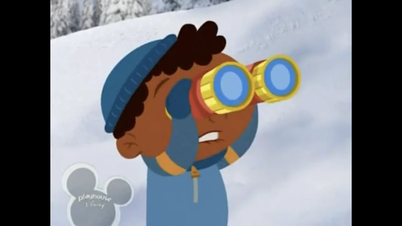 In A Tall Totem Tale, Quincy uses his binocular to look for the big, bigger and biggest polar bear as Quincy and Little Totem Pole head up the polar bear mountain.
