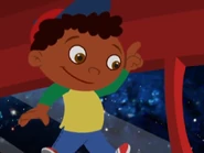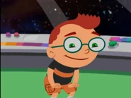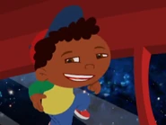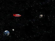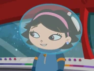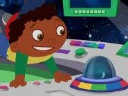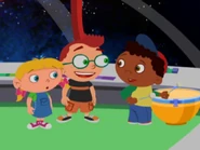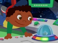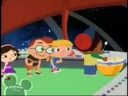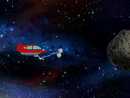 In Ring Around the Planet, Saturn's Ring saw a small fast meteor which is coming toward them, so Quincy got an idea and Quincy told Rocket that they need gravity by using their seats and Quincy deploys his timpani and Rocket uses his drum thumper to drum the meteor away and Leo and other team drum on their laps and Rocket drums the small fast meteor away and they saw a bigger, slower meteor so they all drum on their lap while Quincy uses his timpani to drum the bigger, slower meteor away. They saw the biggest, slowest meteor and when Quincy tries to drum the biggest, slowest meteor away, They notice that Rocket's drum thumper is all tangled up. So June puts on her astronaut suit with Saturn's Ring tether to the rope and June heads out of Rocket and onto Rocket's drum trumpet to do a super spin to untangled the drum thumper and head back to Rocket and they all drum the biggest slowest meteor away and they all drum all three different sized meteors away.