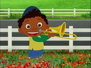 Unfortunately, the big bad blue race car unlatches the gate cause it to open and some cows leave the field and block Carmine's way! So Rocket lands in front of field of cows and they all head out of Rocket and Quincy told Carmine to use his trombone horn. When the cow moos at high note Quincy and Carmine play their trombones at high note and all of the cows head back to the field and the gate latches shut. Soon, the cows moved out of the race track and carmine resume his race and they all head back inside Rocket and blast off! But the big bad blue race car unlatches another gate causing the bigger cow to go onto the race track and Carmine and Quincy play their trombones at lower pitch and all of the cows moved out of the way and back to the field. When Rocket saw that the big bad race car unlatches the last gate and let the biggest cow out, Quincy and Carmine use their trombones to play a lower note to let the cows off the race track and back to the field. Finally, Carmine left the field of cows and resume racing and Annie sings about helping Carmine win the race again while Carmine overtook some of the race cars!