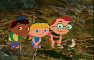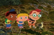 In Duck, Duck, June, the Little Einsteins made to the river forest and they still hear the bear growling as it getting closer. Then, June got a plan about getting past the stream by patting the beat and June leap onto three rocks and made to the other side and June resume patting as the whole team and ducky leaps three rocks across the river and Rocket leap across the river and soon, they made it across the river and got away from the bear. Soon, ducky found the other way out of the forest and ducky follow the whole team out of the forest and head back to Rocket and blast off.