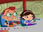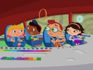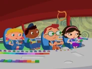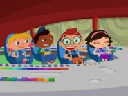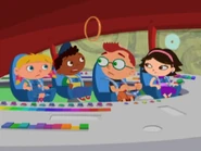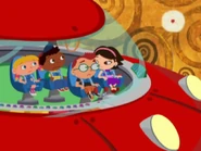 In Ring Around the Planet, the Little Einsteins heard and saw a meep as one of the meeps fly toward them as Leo told that it's a meep and Saturn's Ring comes toward them as friends to each other and landed on top of the whole team and Saturn's Ring tethered to the ribbon and head out to be friends to each other and Saturn's Ring called Rocket put out his loop and tied around the loop and one of the meeps tried to pull Rocket out of the space goo while whole team pat to the beat, but it didn't work so one meep called to another meep to help pull Rocket out of the space goo and they tried to pull Rocket out of the space goo, but it didn't work either. So Annie lead to sing the meep song as the other team sang with Annie and all of the meeps came and help Saturn's Ring to pull Rocket out of the space goo. Therefore, they all pat to the beat to help all of the meeps to pull Rocket out of the space goo and Rocket is free from the space goo and Annie said goodbye to the meeps and head back to the space goo.